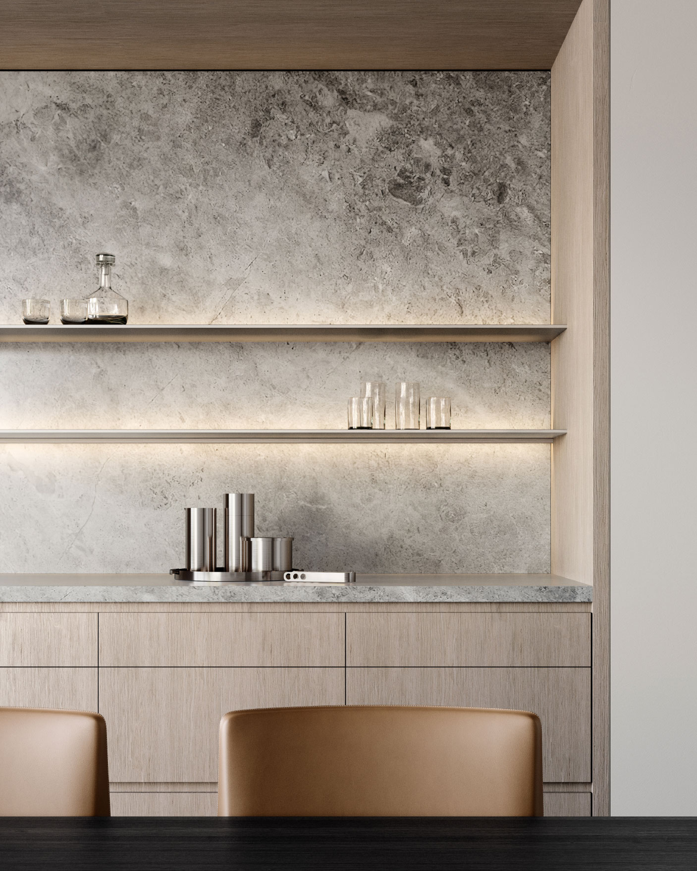 Striking the ideal balance between sophistication and comfort, the open-plan living area is a place to unwind, entertain and gather with loved ones. French Oak floorboards bring a sense of warmth to the palette, juxtaposing beautifully with cool-toned marble surfaces. The joinery has been cleverly designed to suit a range of lifestyles – complete with a stunning built-in bar, entertainment unit and plentiful integrated kitchen storage. Large sliding doors open out to a tranquil terrace area, creating a seamless flow between indoor and outdoor living.