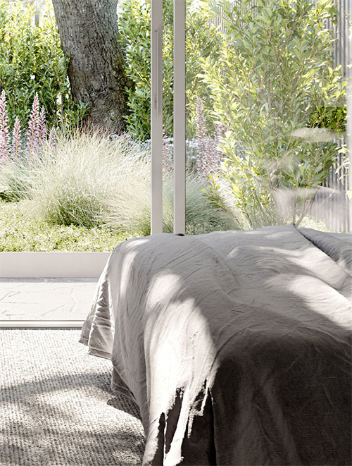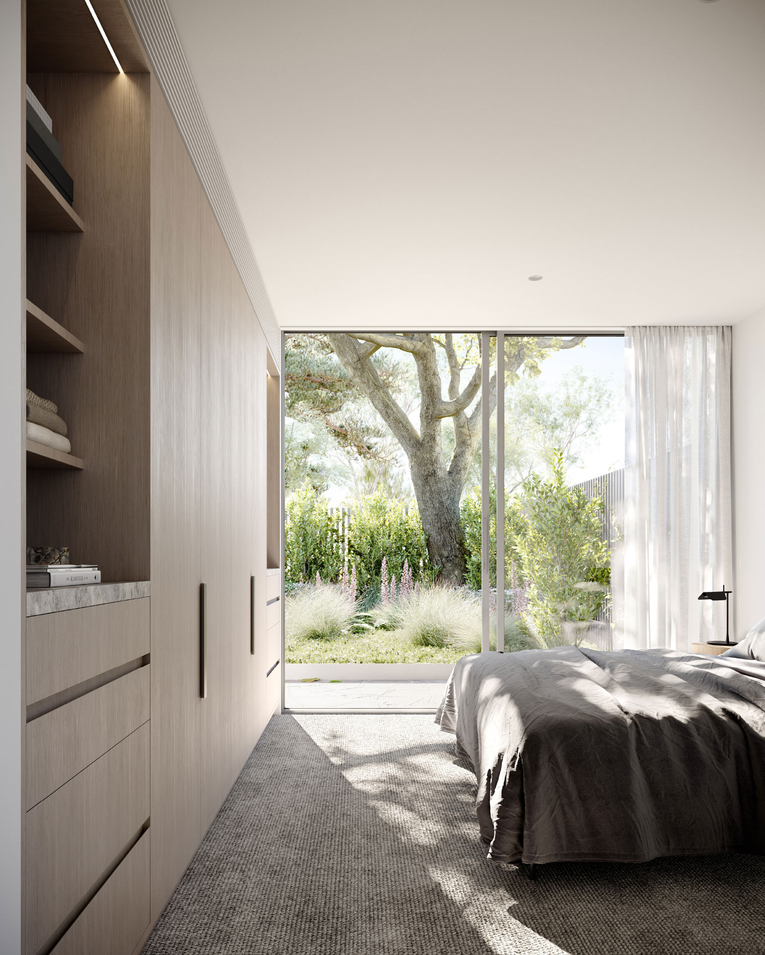 The master suite connects to its ensuite via a spacious and functional walk-in robe. Master robes are meticulously designed to create a place for everything in the wardrobe, including custom drawer felt inserts and LED lighting details. Wide span and full-height glazing offers outward views, with the majority of the master ensuite having a clear path to natural light.