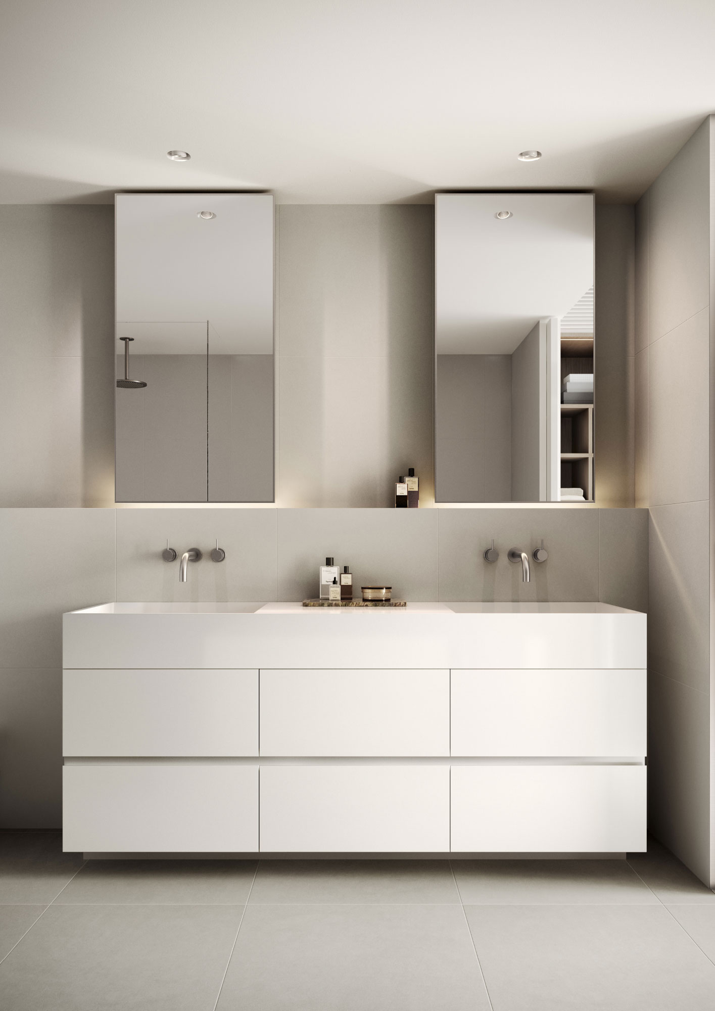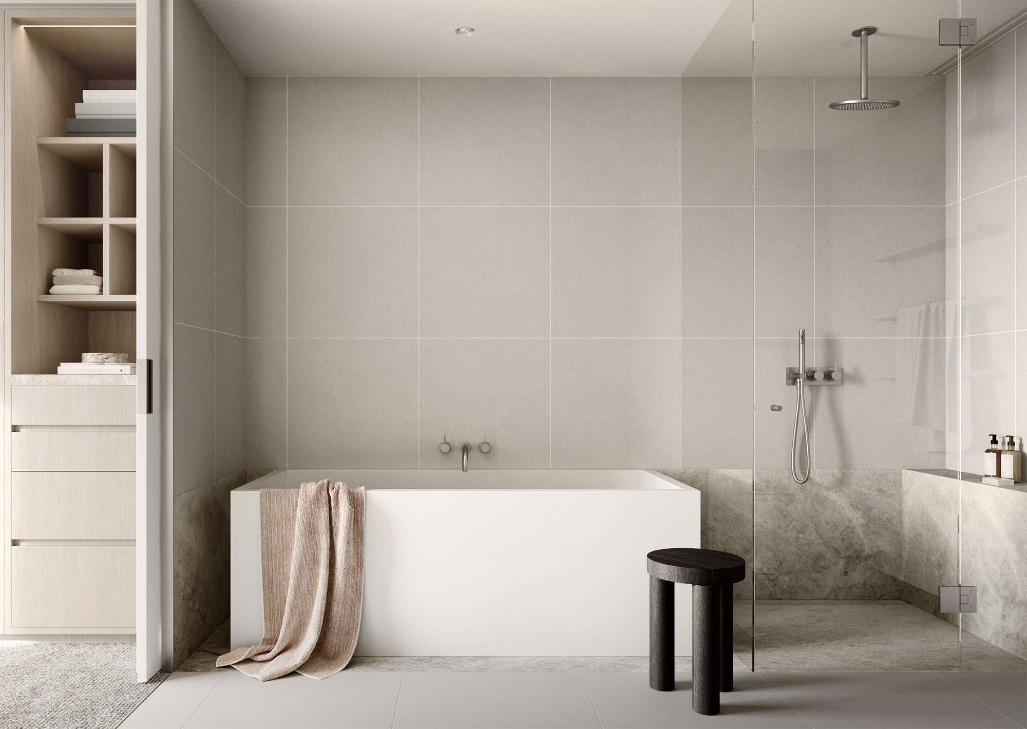 Punctuated by sleek feature tapware, the double vanity will streamline your morning routine while housing all your toiletries with ease. In the evening, treat yourself to a glass of wine in the large luxurious bathtub, or wash the day away in the oversized shower. Textured tiles and marble surfaces create a luxurious yet distinctly organic look and feel.
