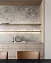 The joinery at the entrance features stone drawers and mirrored finishes, creating a sophisticated arrival experience. There is also considered bar joinery adjacent to the entertaining and dining areas. The TV joinery and display shelving is carried through the stainless-steel details throughout the apartment.